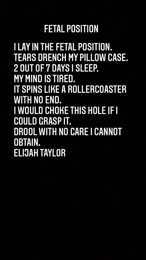 Mental Health Awareness Month Poem Posted byElijah TaylorMay 7, 2021June 21, 2021Posted inUncategorized Copyright 2021 Share this: Click to share on X (Opens in new window) X Click to share on Facebook (Opens in new window) Facebook Like Loading... Related Published by Elijah Taylor My name Is Elijah Taylor and I am a education major and poet. I am from Dallas, Texas and my favorite hobby is exercising. View more posts