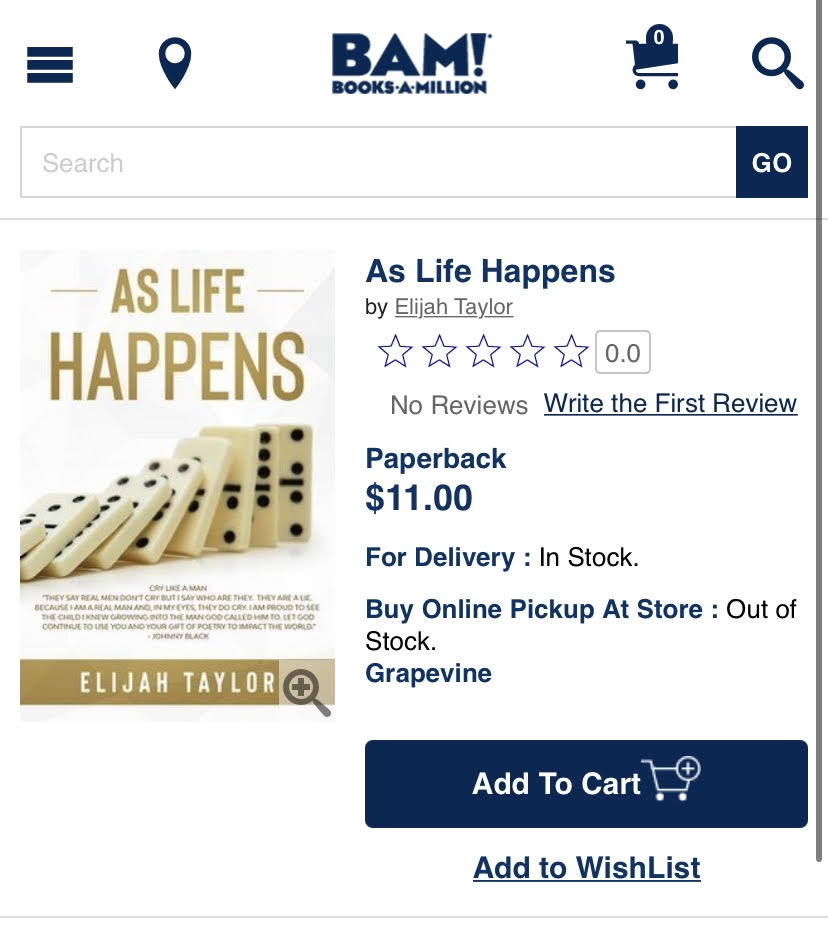 As Life Happens is now available on Books A Million for $11. https://www.booksamillion.com/p/Life-Happens/Elijah-Taylor/9780578795614?id=8058525053641
